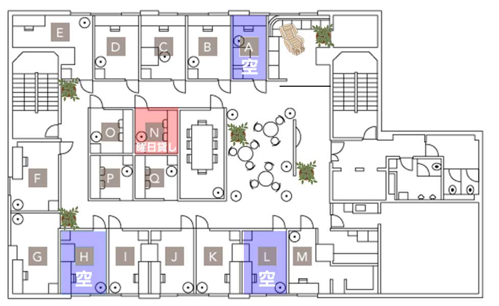 ご利用状況 | ご利用目安 (人数) | 面積㎡ | 賃料 (月額税込) | 共益費 (月額税込) | 備考 | |